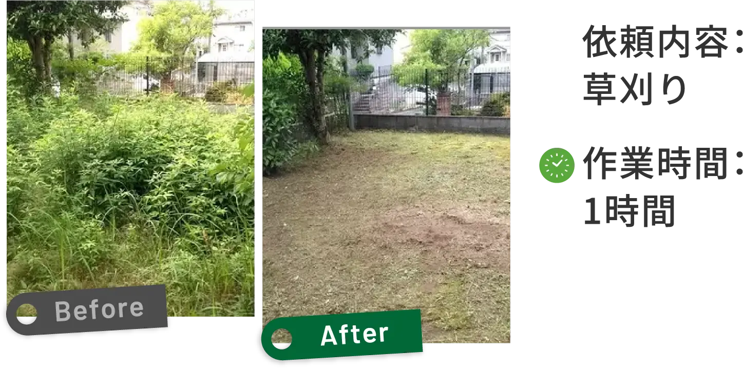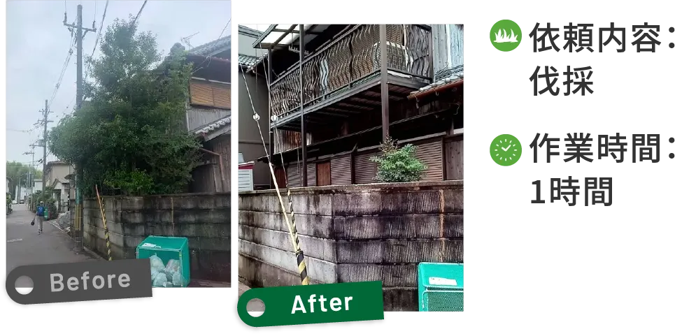 2年放置されていたためかなり茂っていましたが、スッキリと剪定しました。お客様のご協力もあり、問い合わせから作業完了までスムーズに進み、仕上がりの速さにもご満足いただけました。